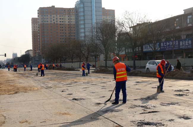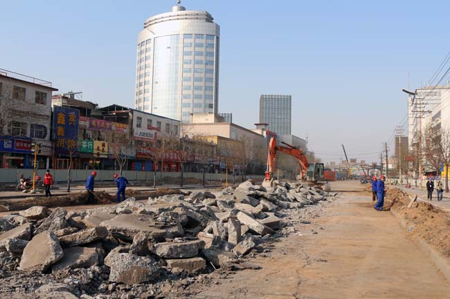 鼓楼南北街拓宽改造现场(二) 2月28日清晨,逐渐回暖的临汾城迎来了特殊的一天。作为市区“主动脉”的鼓楼南北大街,早在七个小时前就被天蓝色的彩钢围栏封闭起来,准备接受拓宽改造“手术”。作为参建单位,我集团主要负责河汾路坂下路口至贡院街十字口标段的施工,作业总长度达2400余米,计划于10月底前完成。